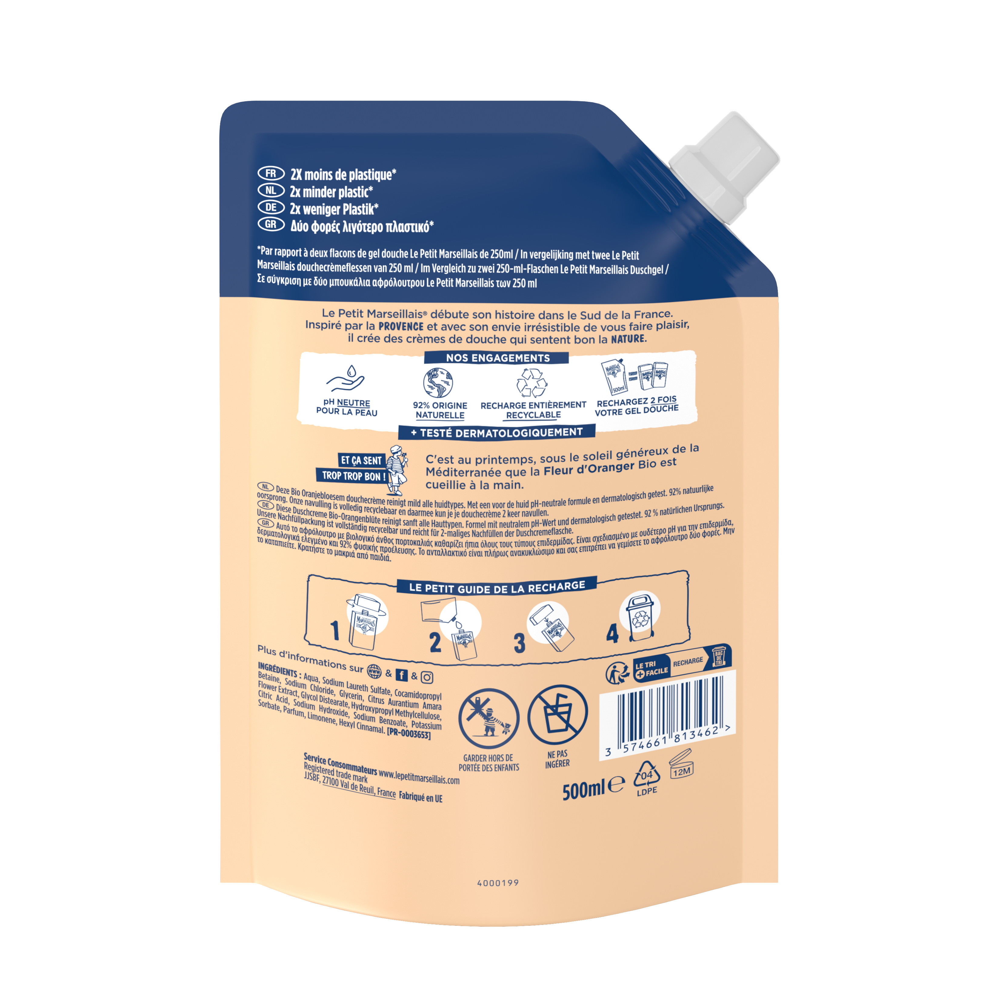 Tout le plaisir de notre Crème de Douche Extra Douce Fleur d’Oranger BIO, dans une recharge de 500ml plus économique !