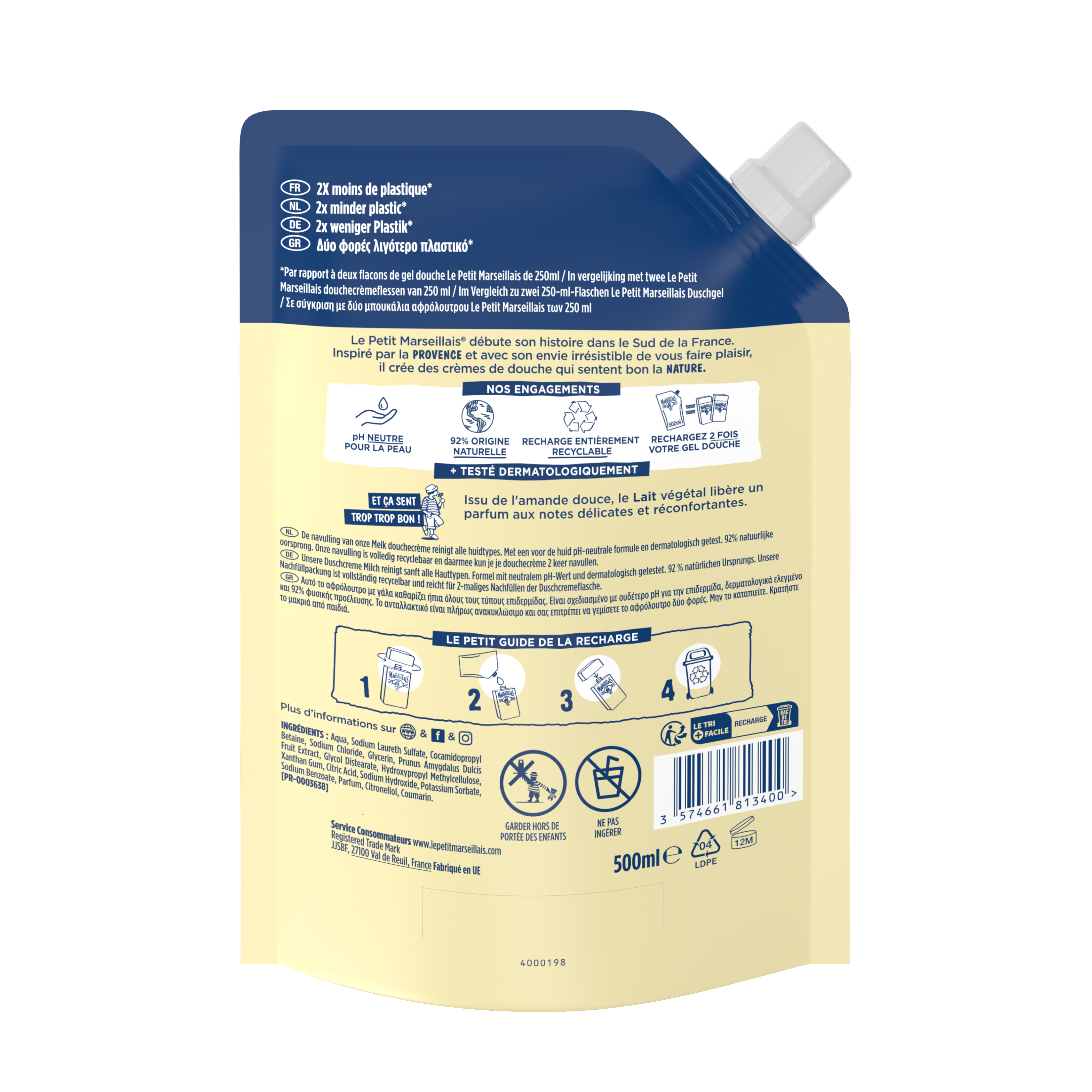 Tout le plaisir de notre Crème de Douche Extra Douce Lait, dans une recharge de 500ml plus économique !
