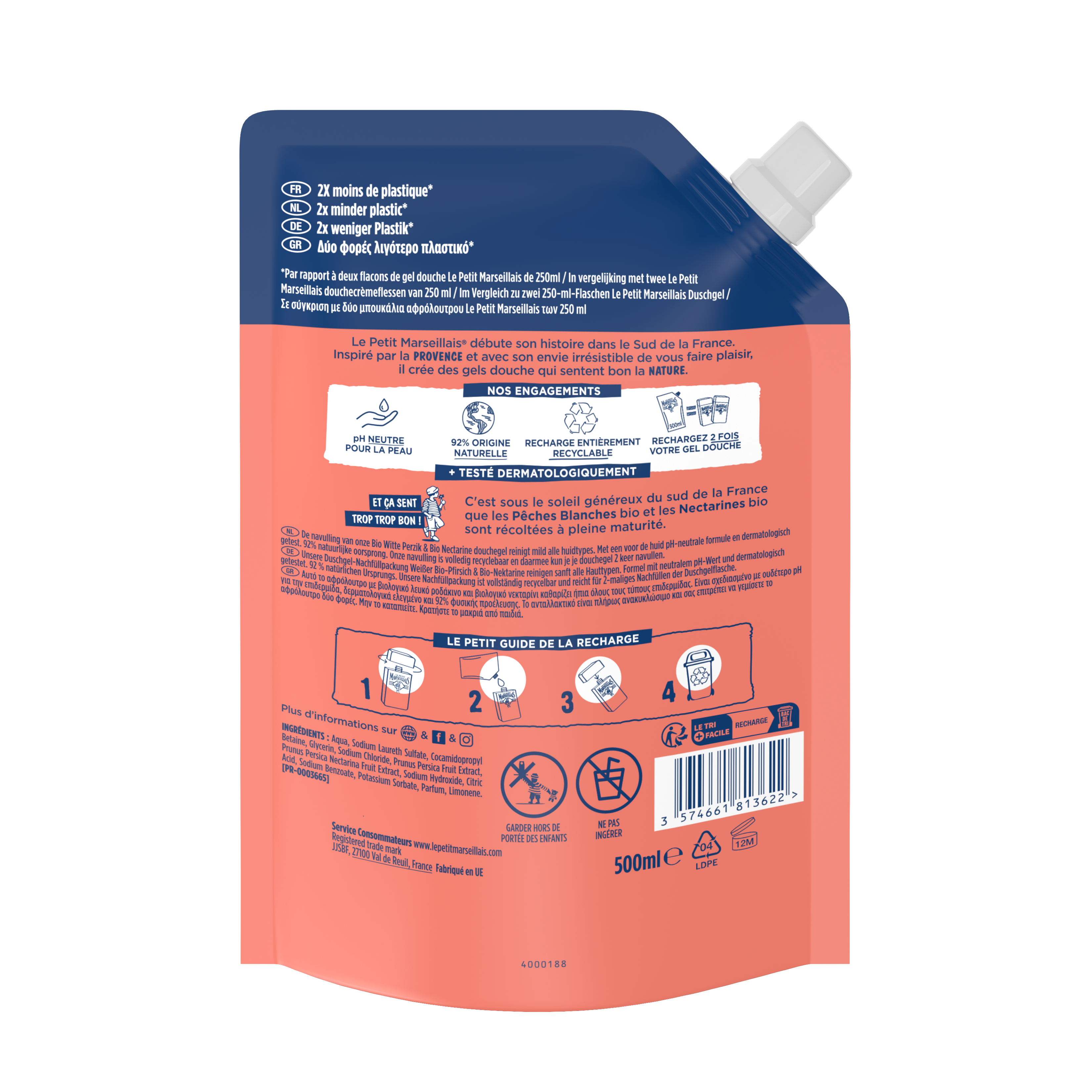 Tout le plaisir de notre Gel Douche Extra Doux Pêche Blanche BIO & Nectarine BIO, dans une recharge de 500ml plus économique !